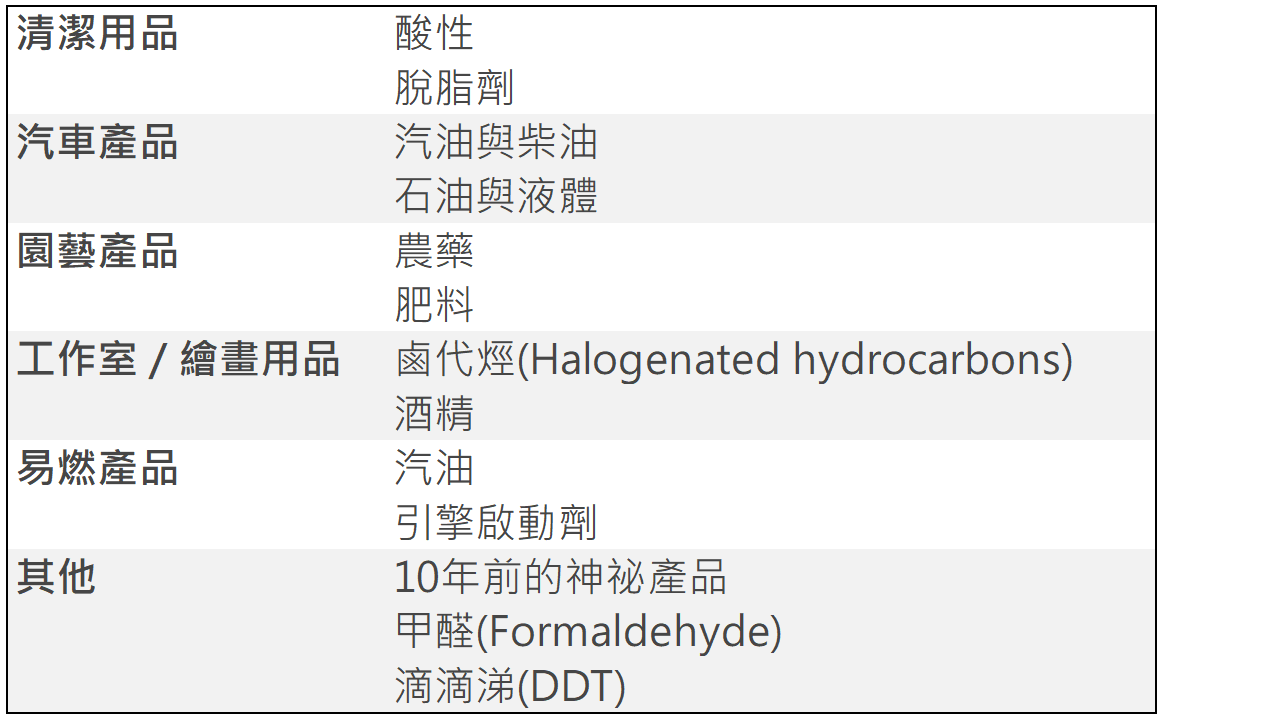 表1. 美國國家環境保護局已將數百種潛在化學物質歸類成以下幾類